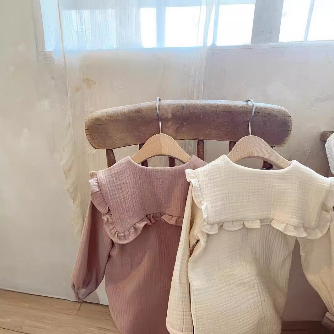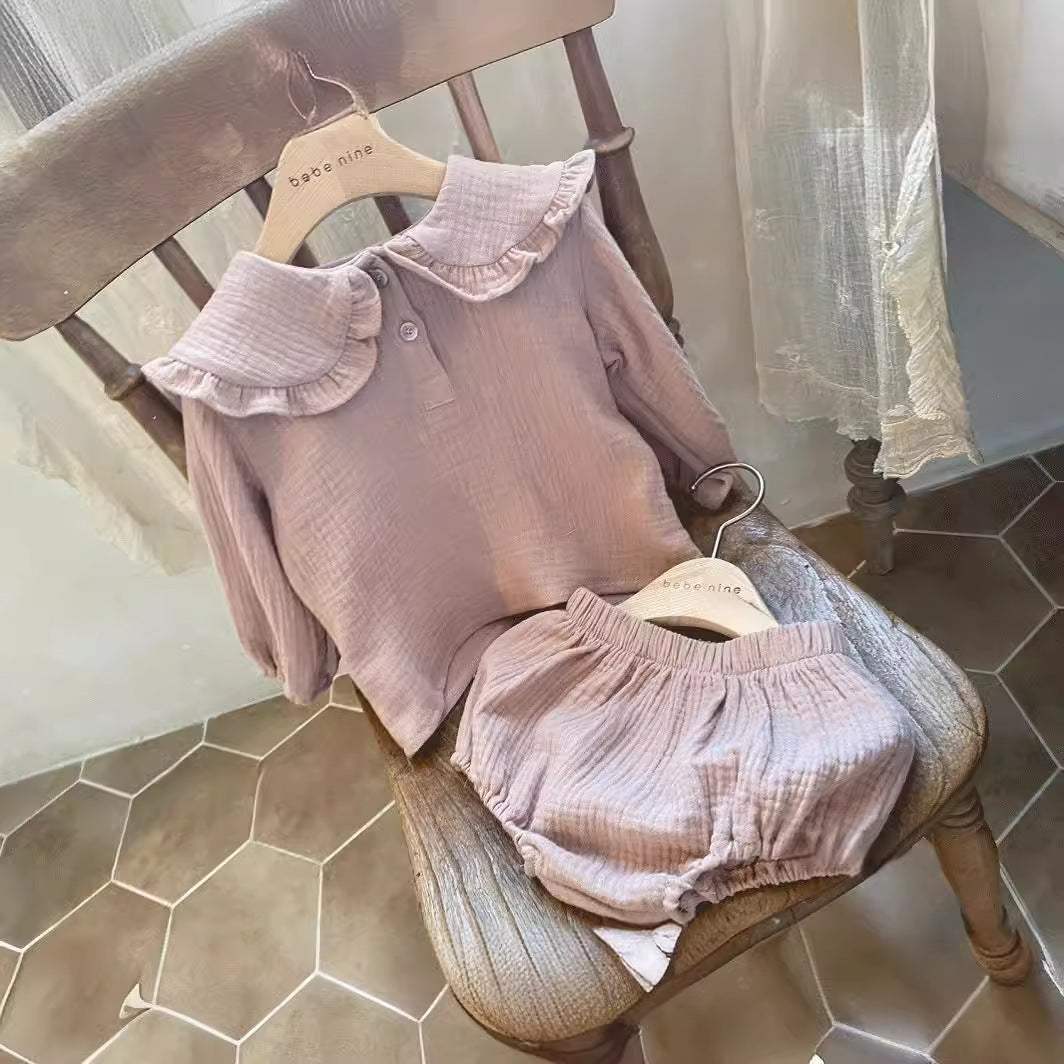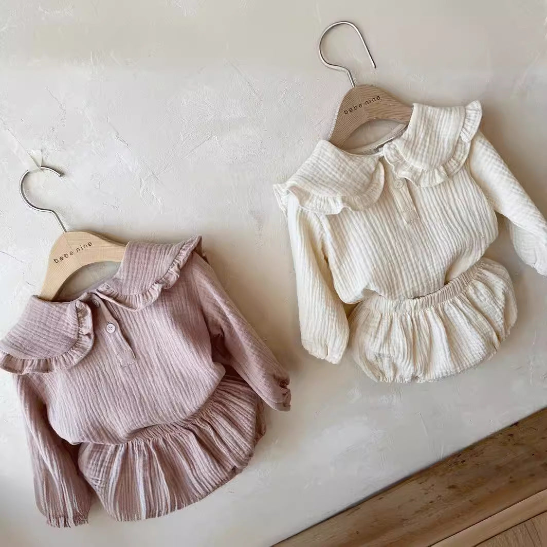 Baby Neutral Linen Style Pull Over Collared blouse and matching bloomer outfit