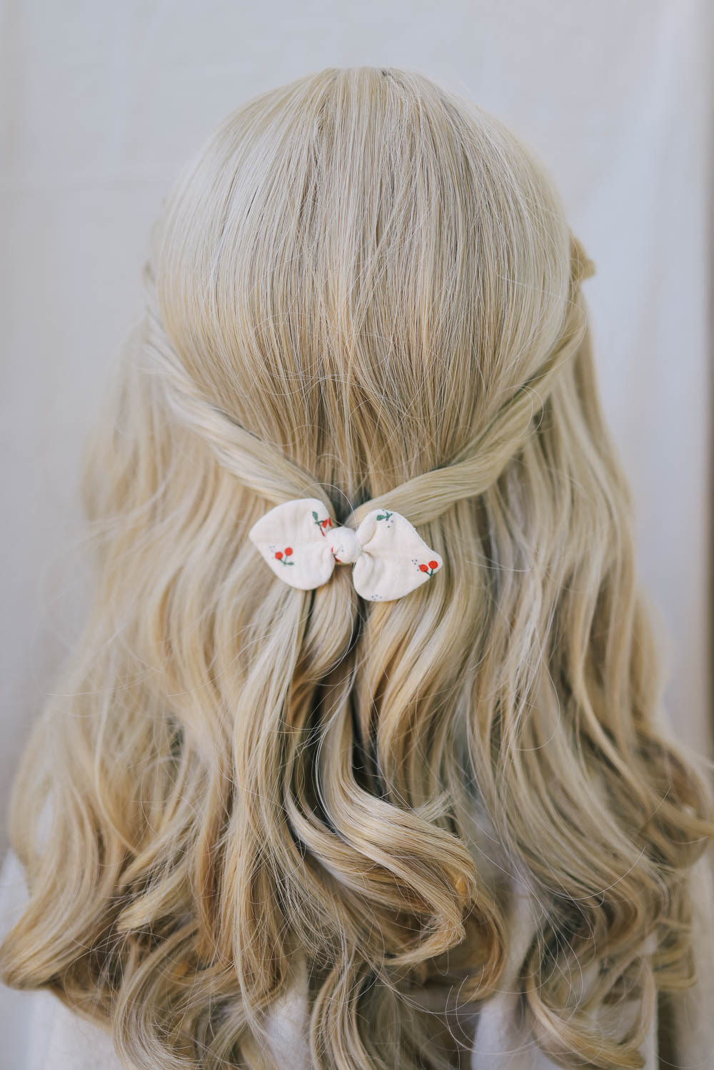 Never go a season without the the rocking the cherry print classic style bow! Shop this beautiful handmade Bunny knot bow twist elastic hair tie with gold detail and linen feels. Make sure to shop our collection of handcrafted hair accessories and more!