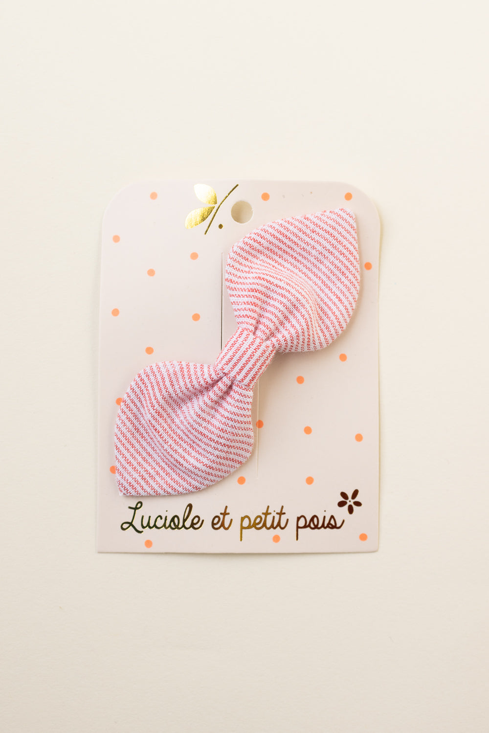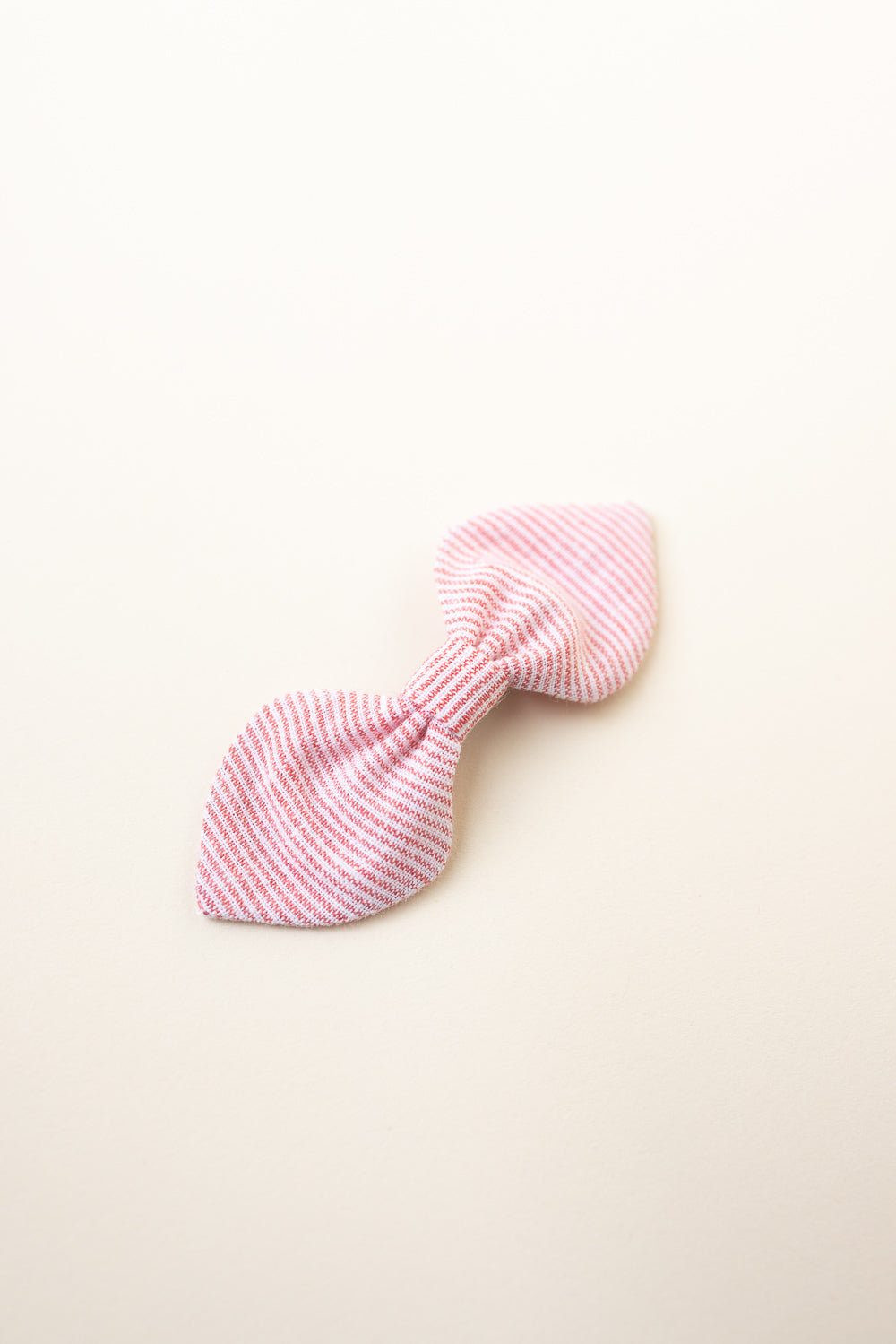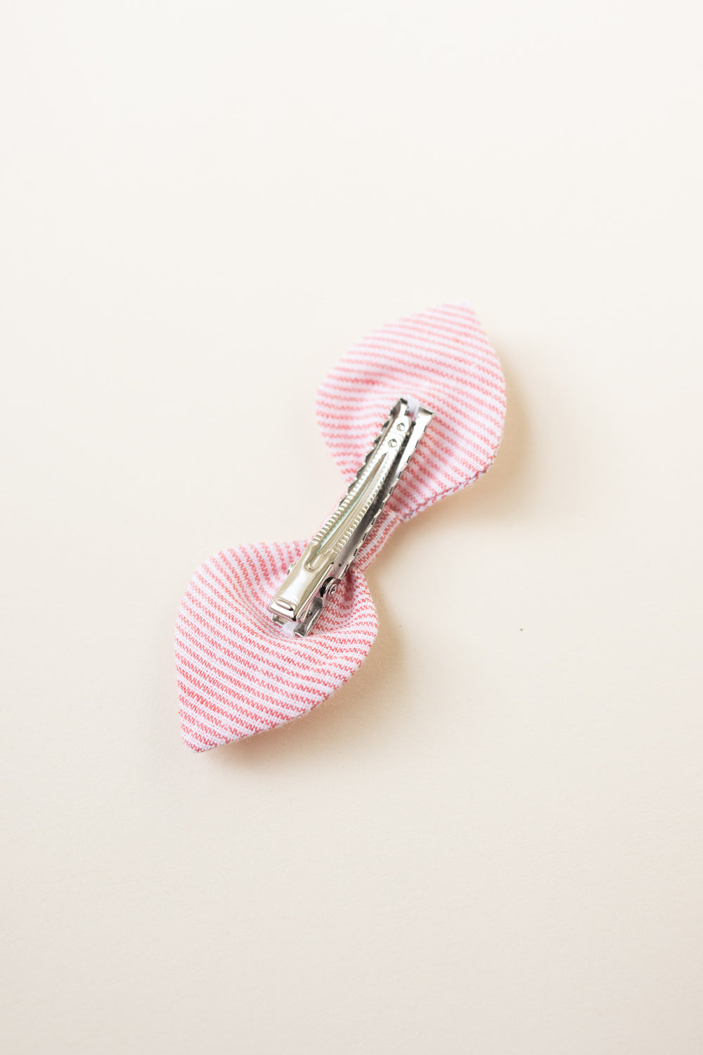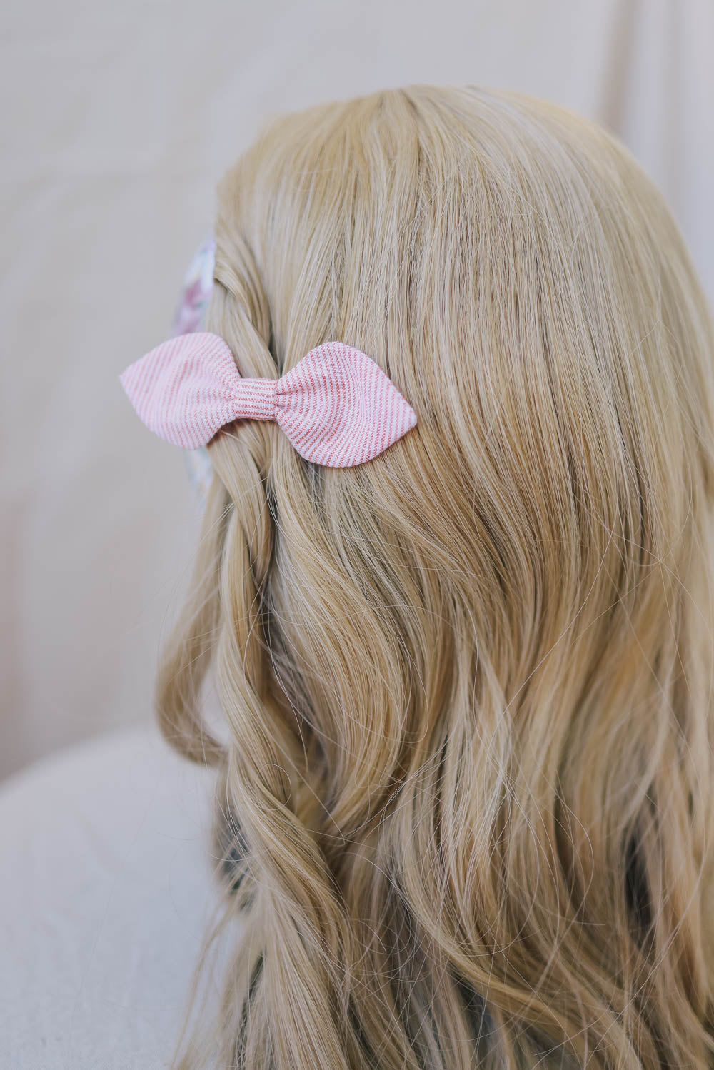 We love a classic dainty statement piece! Treasure this Pink Candy Striped Bunny Bow Alligator Style Barrette to add to your collection of beautiful bows. Wear it with your little one's updos or side parts, it's handcrafted with linen pressed fabric that is sewn to perfection.