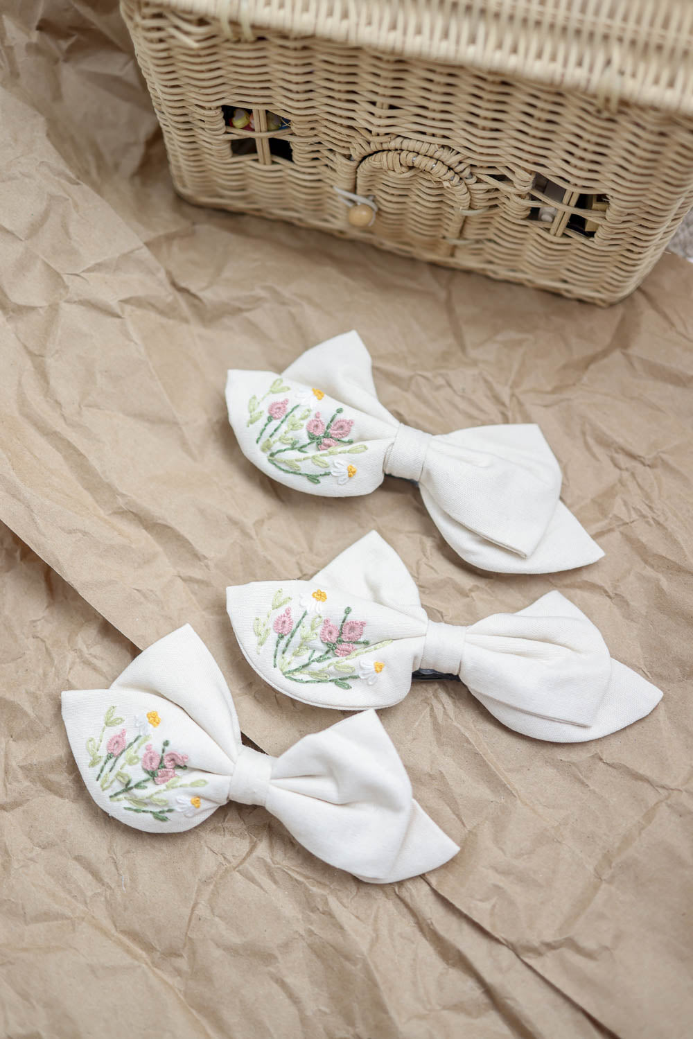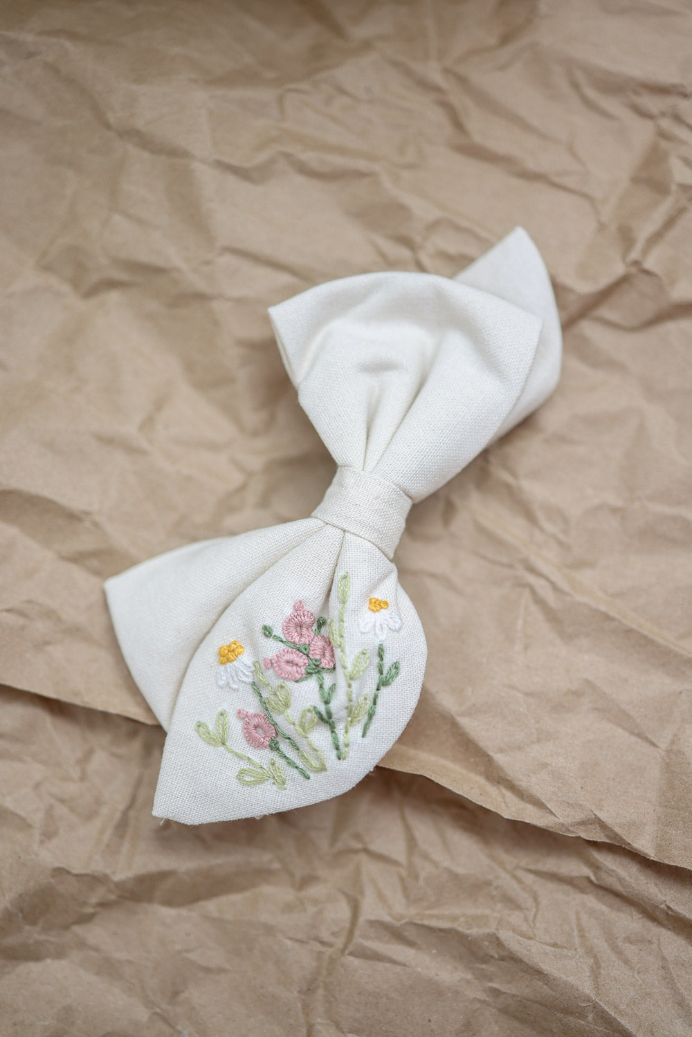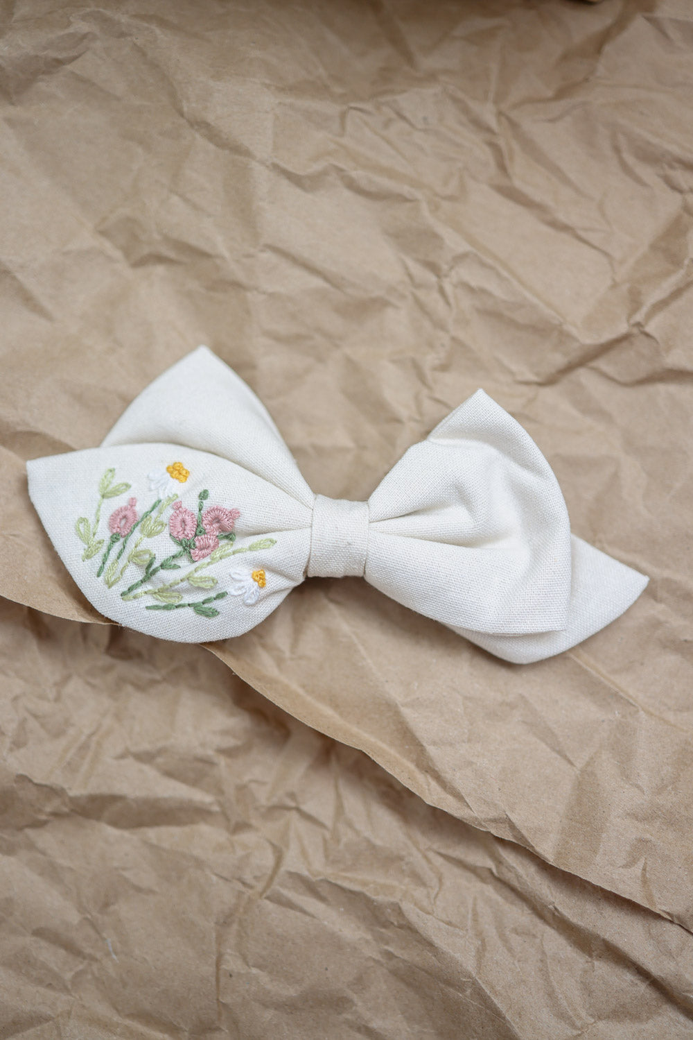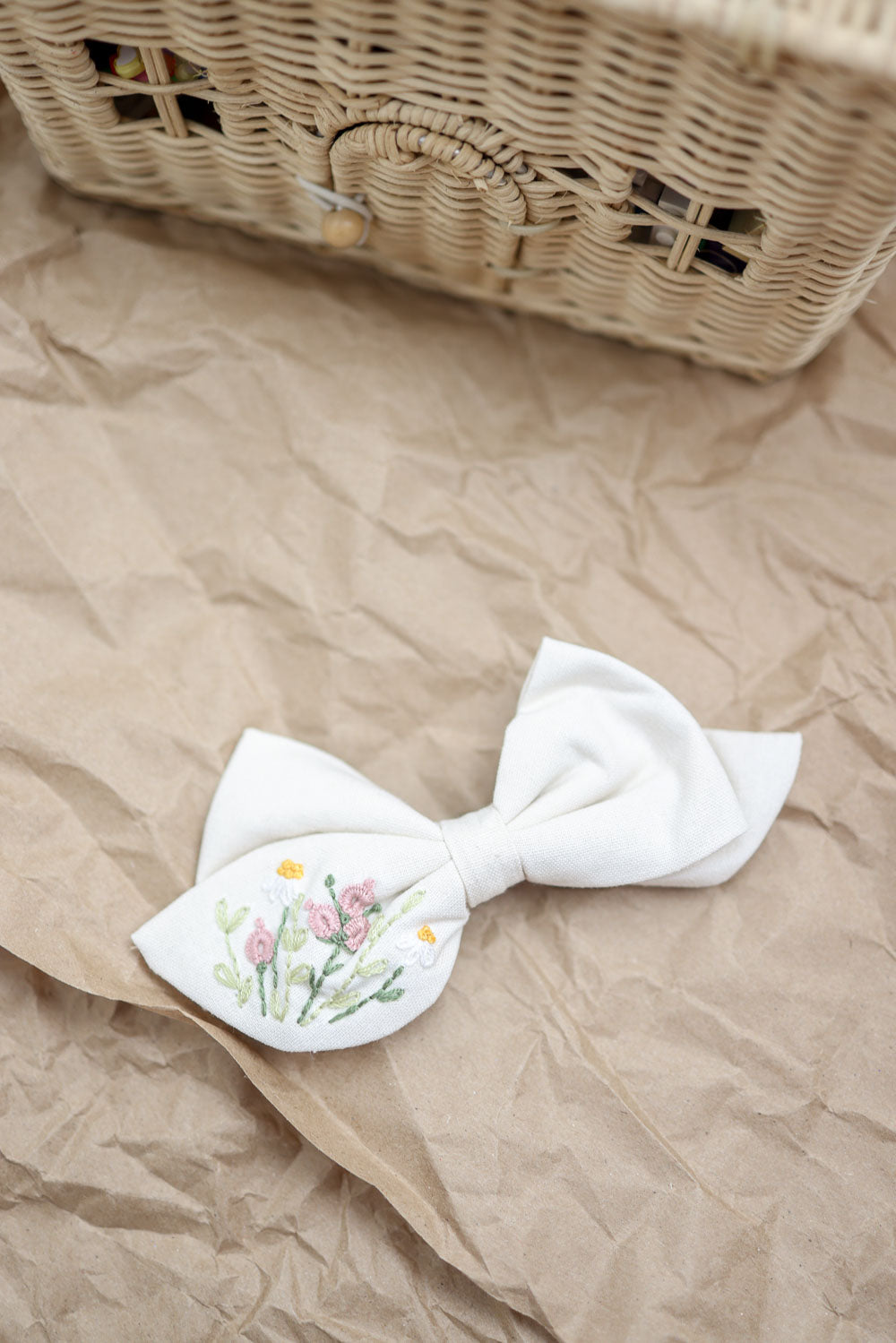 Swoon over your little girl's hair with our darling Coquette Spring Wildflower style embroidered linen bow hair clip. Perfect for first day of school or a special occasion. Shop for more!