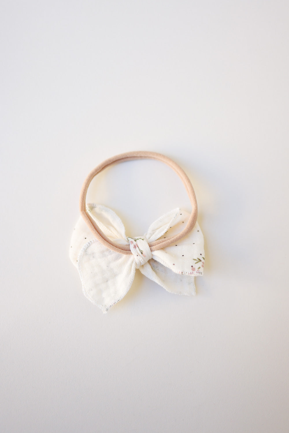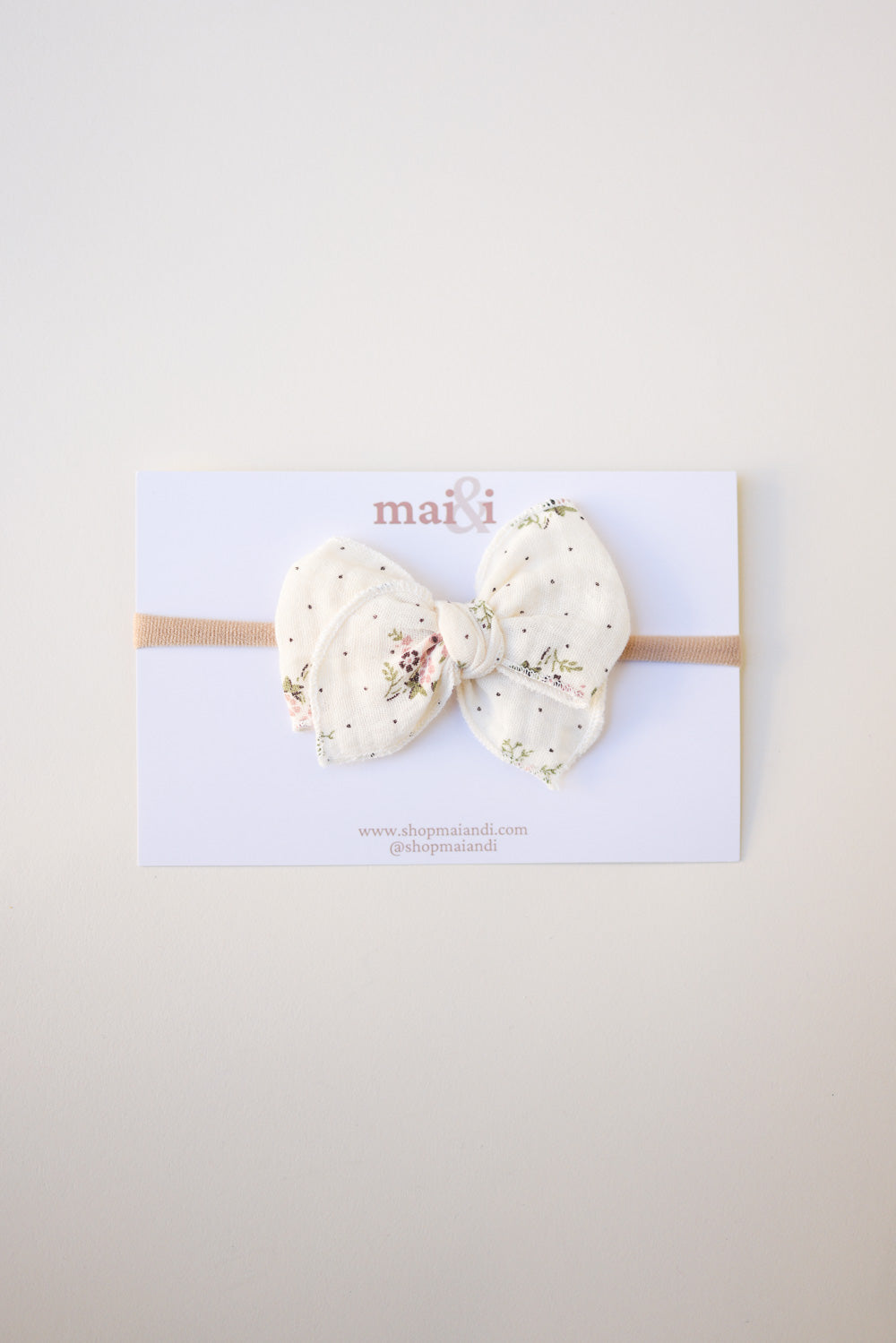 Feel that soft feminine vibes with our collection of Mai&i's fabled bows! This floral dot soft baby head wrap bow just exudes coquette and cottage core vibes. The bows from this collection are are approximately 3 inches by 3 inches with a nylon wrap so soft for your little baby girls.