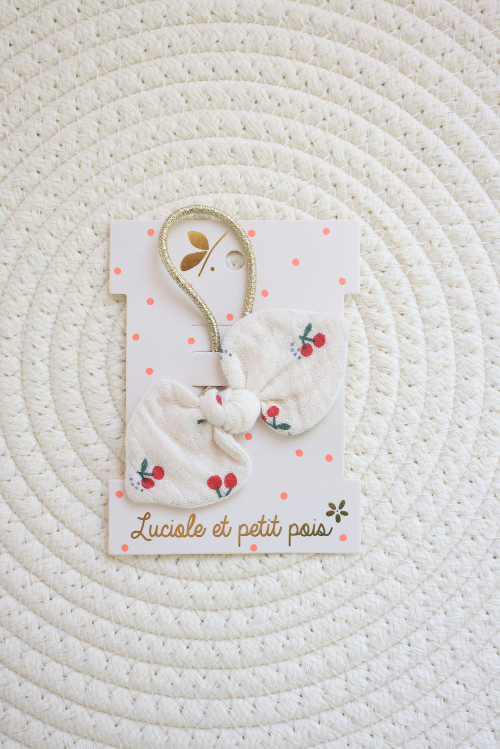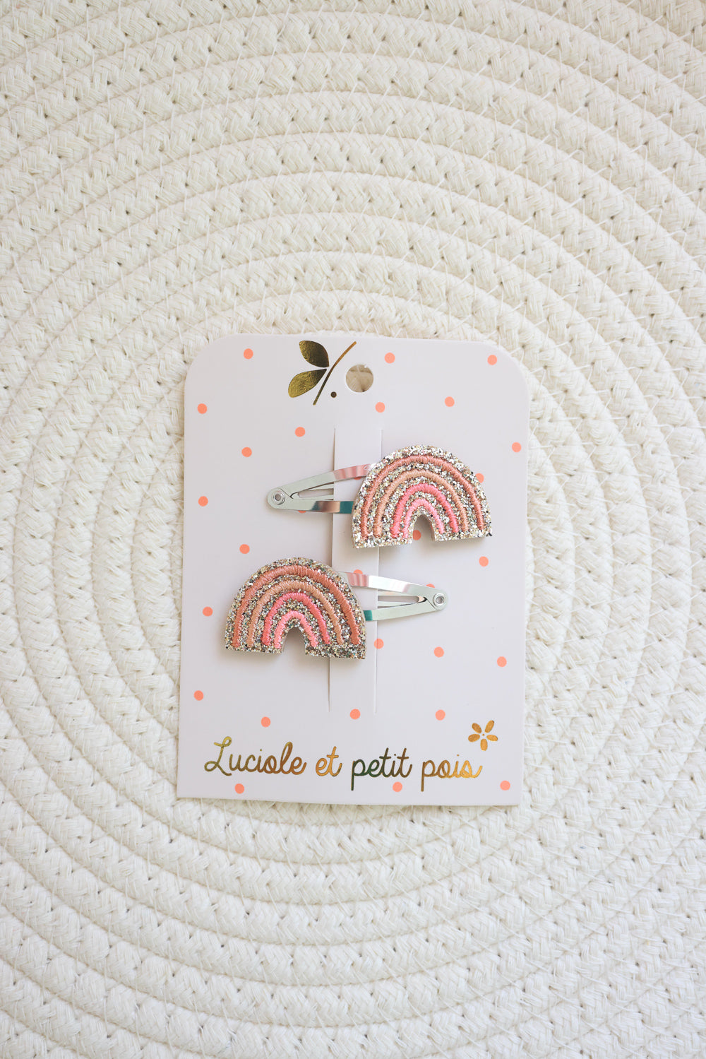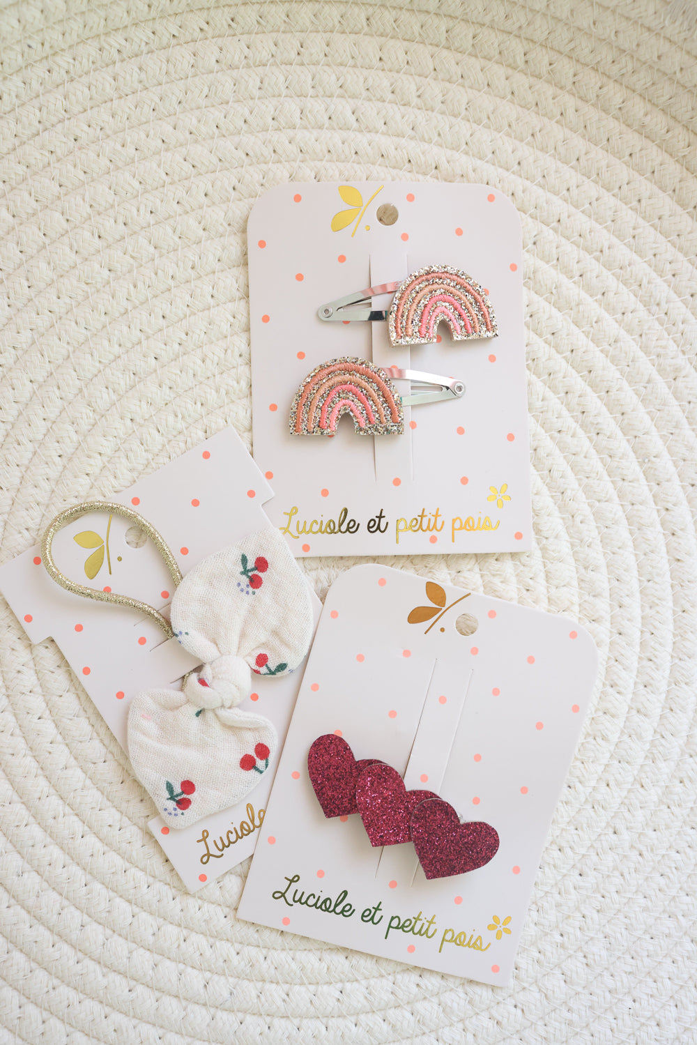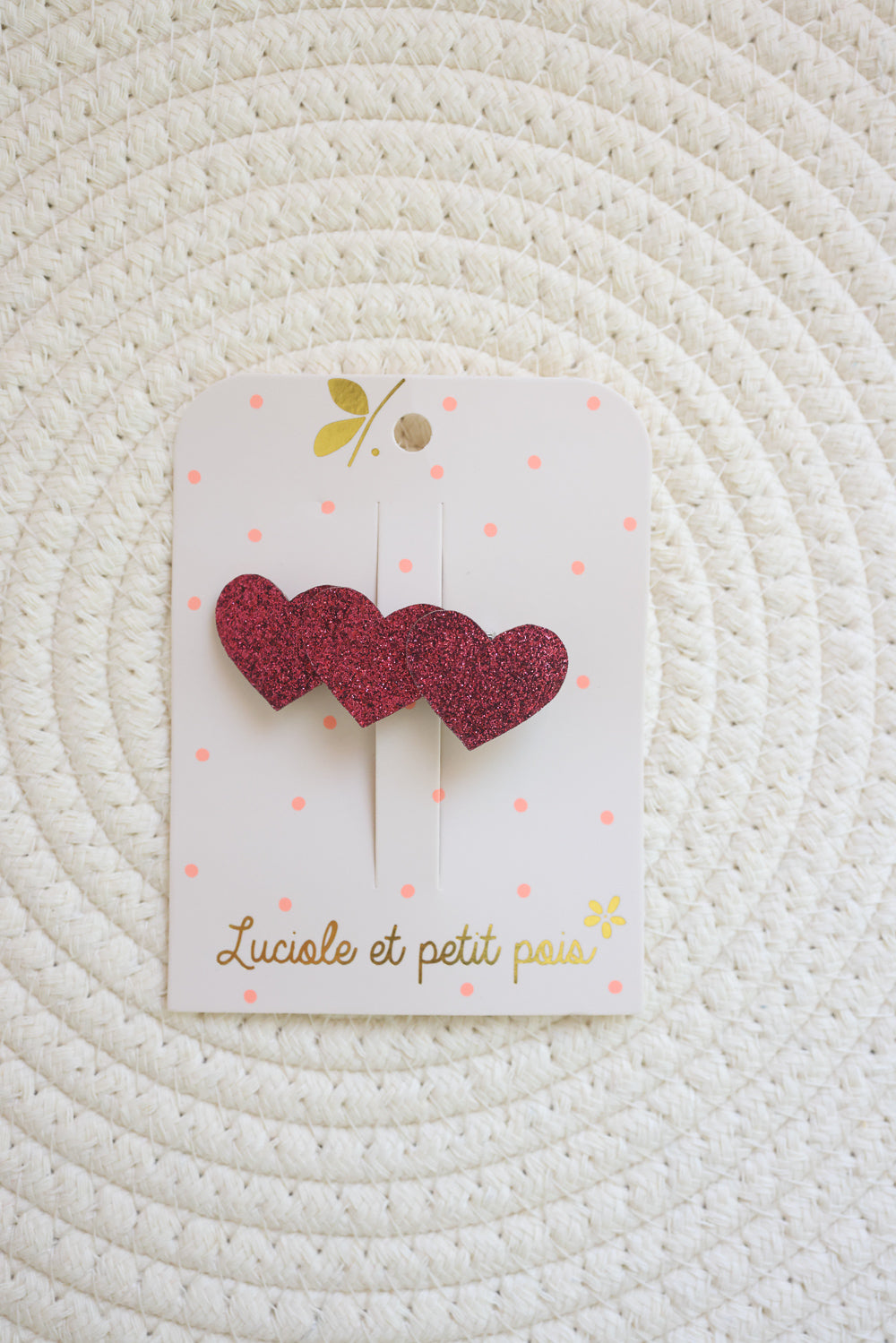 Get a better deal when you purchase three of our cutest hair accessory for your little one! A best selling felt glitter hand crafted rainbow clip, three heart pink glittery barrette and a cute cherry hair tie! Shop more of Luciole et petit pois collection by browsing through our barrette section!