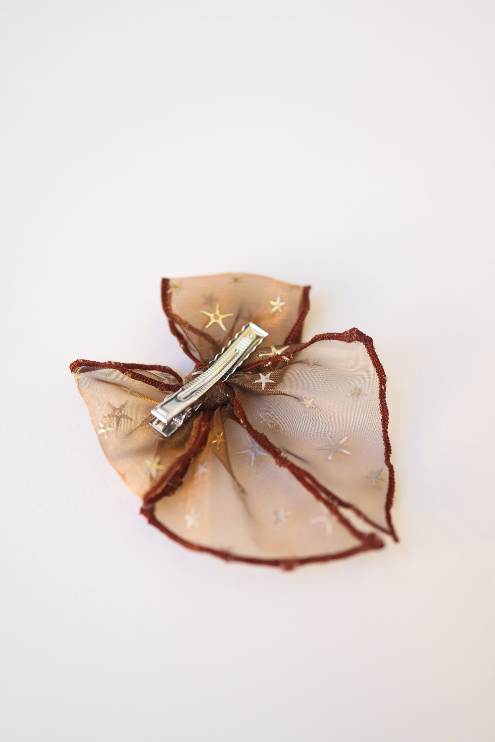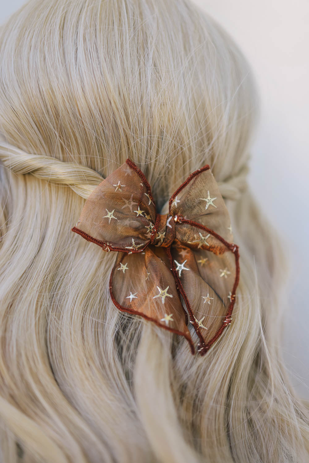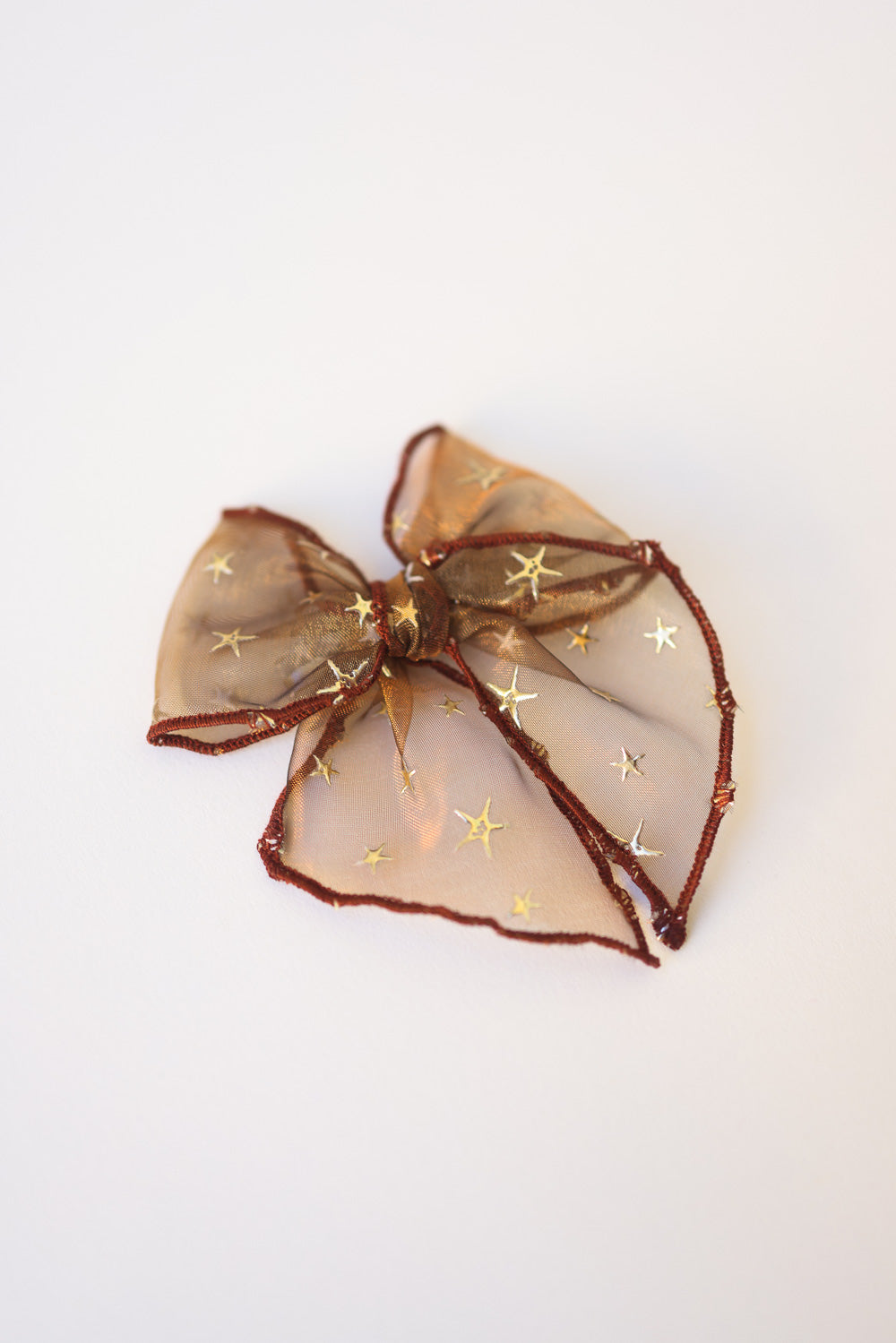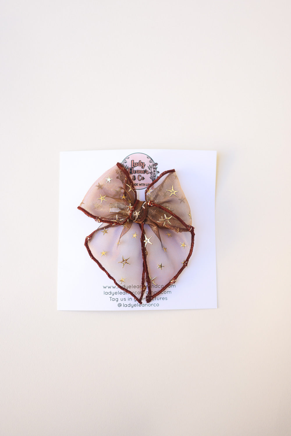 Look absolute celestial and cute with our Golden Flocked Autumn Brown Sheer Mesh Bow by Lady Eleanor and Co. Shop unique girls bows and more! We love it's tight knot, brown serged trim look!